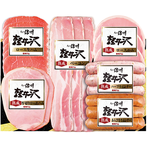 内容:熟成ロースハム42g、熟成ベーコン45g、熟成あらびきウインナー58g、熟成ハーブウインナー58g、ロース生ハム30g、熟成厚切りロースハム60g