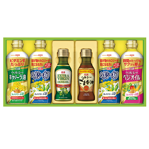 内容:ヘルシーオフ350g×2、ヘルシーベジオイル・ヘルシーキャノーラ油各350g、エキストラバージンオリーブオイル145g、ヘルシーごま香油145g