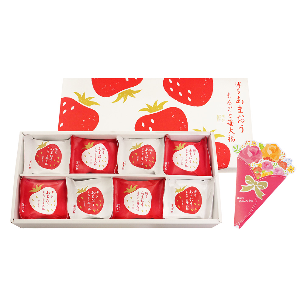 Mサイズの博多あまおうを、まるごと1玉使用した紅白2種類の苺大福。