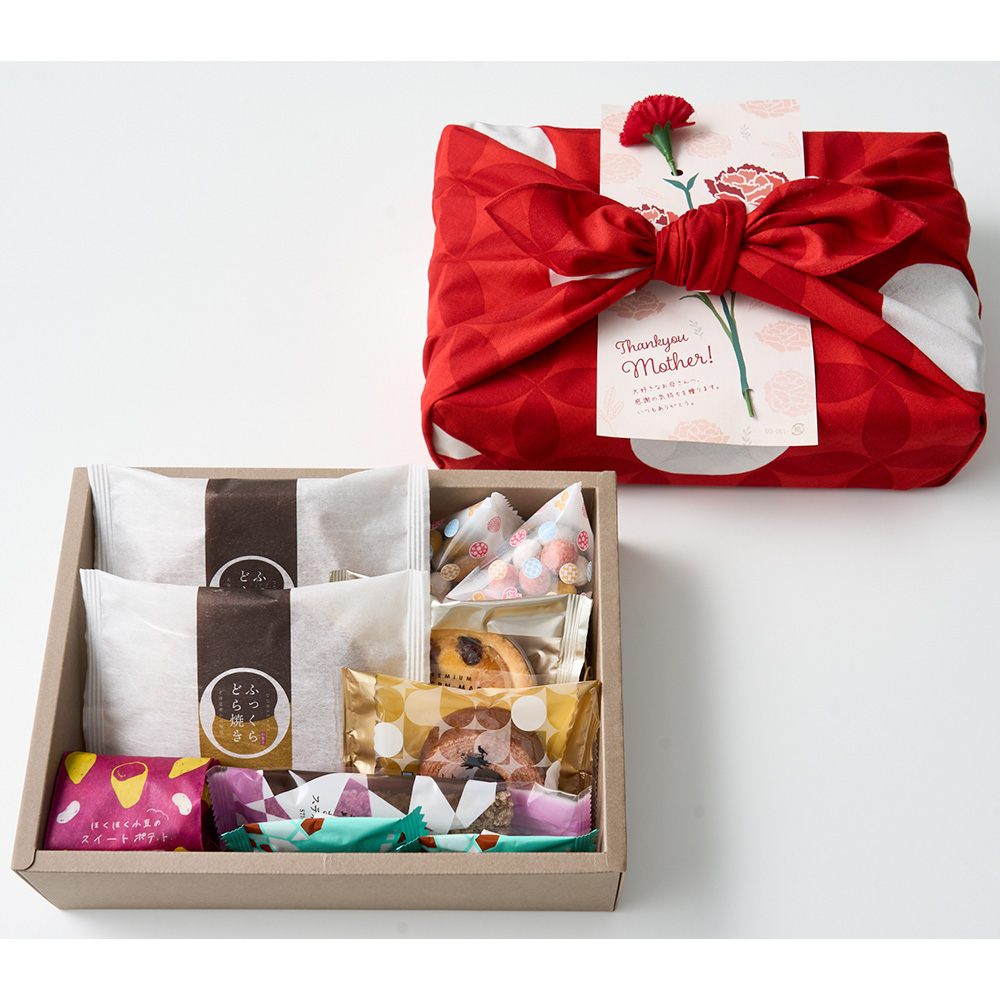 和菓子と洋菓子をバラエティ豊かに詰め合わせ、一輪挿しのカーネーションを添えました。