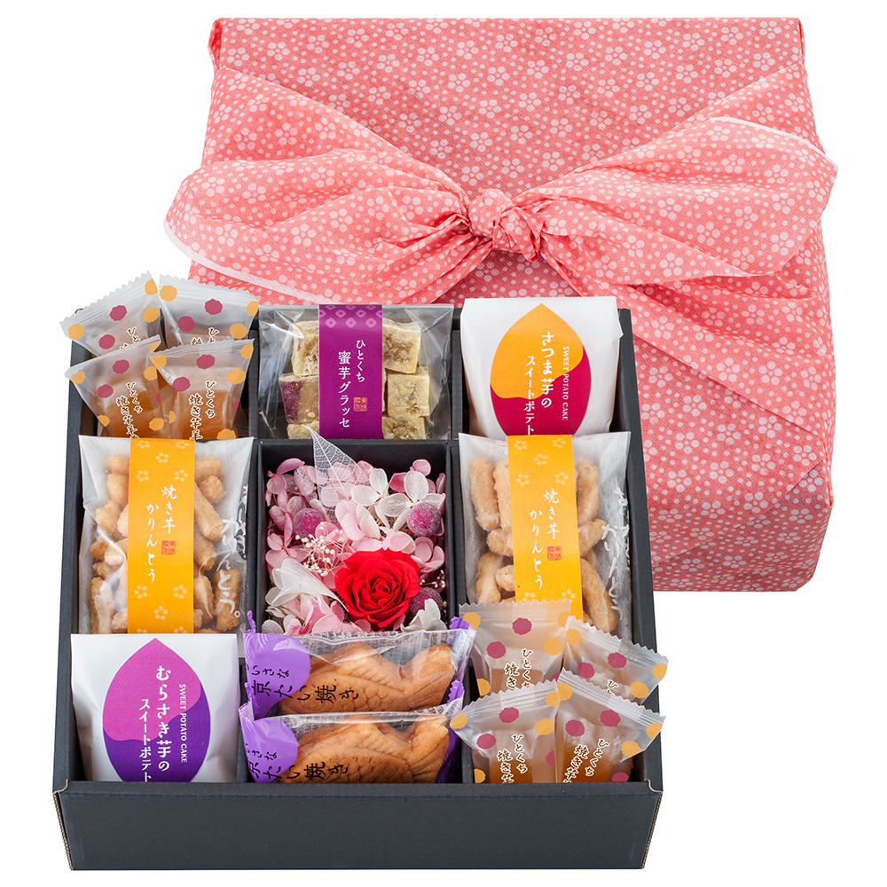 お母さんが大好きなちょっといいお芋のお菓子に、心ばかりのプリザーブドフラワーを添えて。