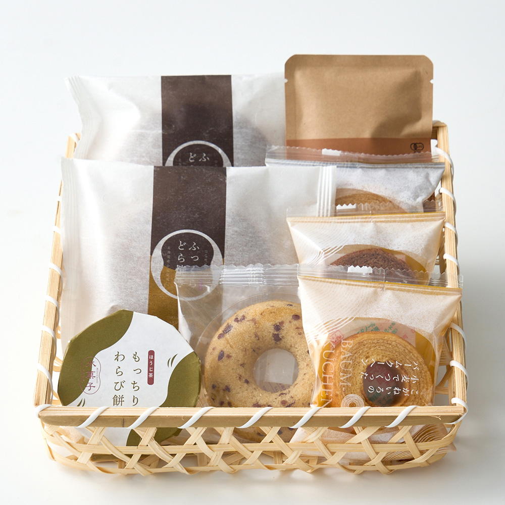 どら焼きや、わらび餅、焼きドーナツと3種類のバーム、有機焙じ茶を手作りの竹籠で包みました。