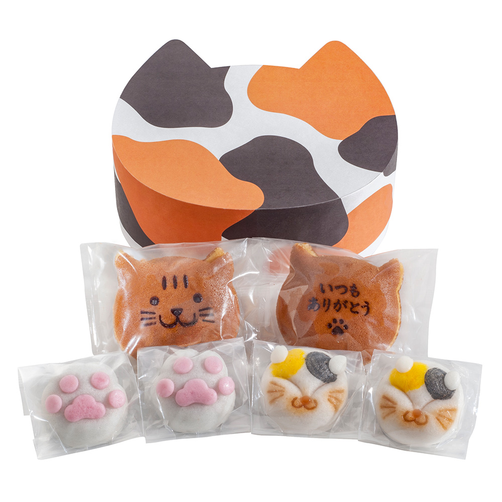 ◆内容/猫どら焼き(小豆あん・しろあん×各1)、三毛猫饅頭・肉球饅頭×各2(計6)