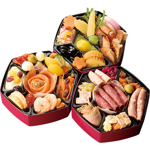 内容:4.5寸 三段重 38品目【一段:和風12品】紅白蒲鉾・海老の姿煮・鶏の香味焼・数の子醤油漬・鮭の西京焼・花人参・伊達巻×各2,田作り12g、紅白なます25g、栗金団35g、黒豆蜜煮30g、若桃甘露煮【二段:洋風13品】海老のゼリー寄せ・グリーンオリーブのハーブオイル漬・セミドライトマト・モッツァレのハーブオイル漬・杏子蜜煮・海老のマリネ・海老風味のガランティーヌ×各2、人参のマリネ20g、フルーツフロマージュ40g、白いんげん豆トマト煮25g、ローズスモークサーモン、ドライトマト赤ワイン煮、ドライプルーン赤ワイン煮【三段:洋風13/14品】グリーンオリーブのハーブオイル漬・ビアサラミ、ホワイトパストラミ・ヤングコーンのピクルス・リオナソーセージ・カンパーニュ・合鴨スモーク×各2、ラタトゥイユ30g、紫キャベツのマリネ15g、ザワークラウト5g、レンズ豆の煮込25g、カリフラワーのピクルス、ローストビーフ、人参のピクルス×各4