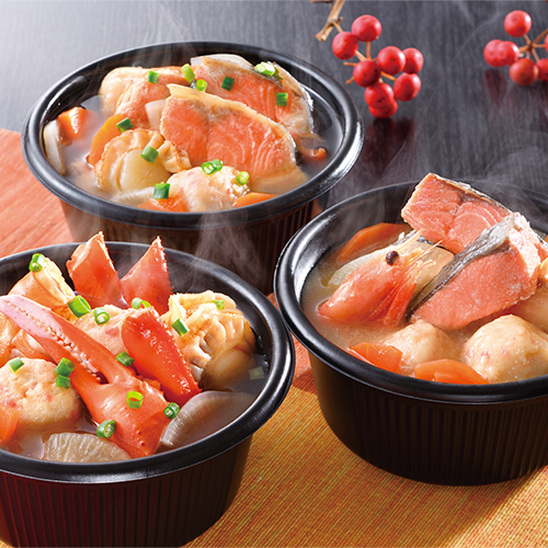 容器ごとレンジで温めるだけで食べられる1人前の海鮮鍋セットです。「石狩鍋」、「かに鍋」、「鮭うしお汁」3種類の味をお楽しみください。