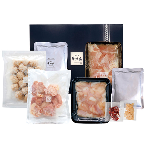 内容:水たき濃縮スープ・華味鳥切り身・華味鳥つくね・もつ鍋スープ醤油(濃縮)・牛小腸各200g、鶏はらみ100g、にんにくスライス5g、唐辛子1g