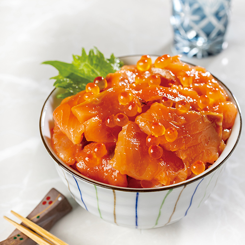 北海道産の新鮮な秋鮭といくらを使用。生食仕立てのづけサーモンに甘口醤油に漬けたいくらをトッピングしました。