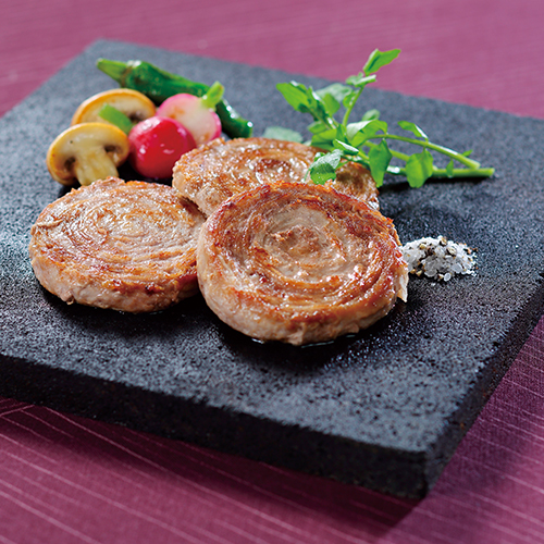 氷温熟成をした鳥取県産の大山豚をスライスし、まきすでロール状にしました。お箸でほぐれる柔らかさです。