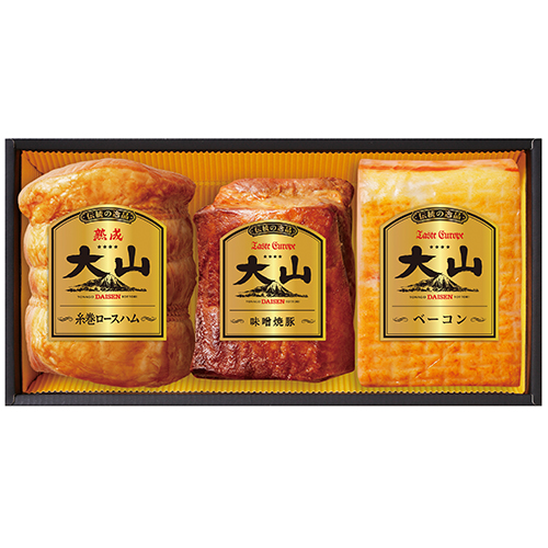 内容:熟成糸巻きロースハム320g、味噌焼豚200g、ベーコン280g