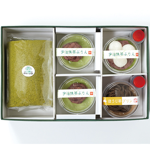 内容:贅沢抹茶ロールケーキ、宇治抹茶白玉プリン115g・宇治ほうじ茶プリン95g、宇治抹茶プリン95g×2、宇治抹茶みつ・黒みつ各15g