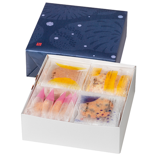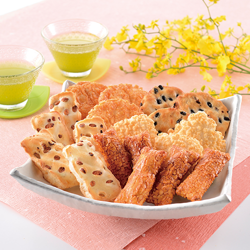 内容:越乃豆もち・黒大豆せんべい×各14、田舎おかき醤油味×11、揚もち×10、黄金揚げ×6