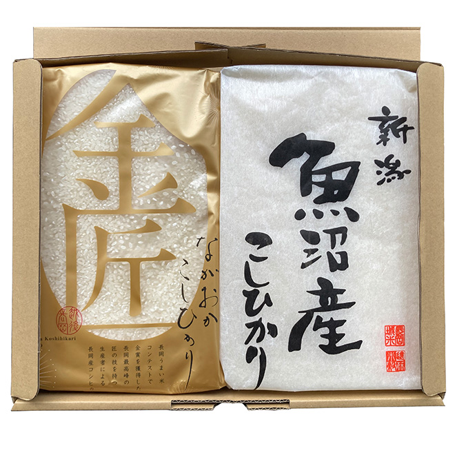 長岡市が主催する食味コンテストにて上位入賞した長岡最高峰の匠の技をもつ生産者が栽培した「金匠ながおかこしひかり」と、五ツ星お米マイスターがその年最良の原料米を厳選した「八海山魚沼こしひかり」の詰合せ。