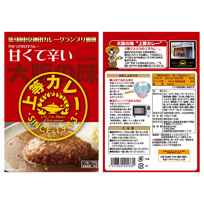 大阪で大人気の上等カレー。 厳選された牛肉と玉葱を使用し、独自にスパイスを調合。 一口目は甘く、すぐあとから心地よい辛さが口の中に拡がります。 この”やみつき系あまからカレー”を親しみやすい家庭の味に仕上げました。